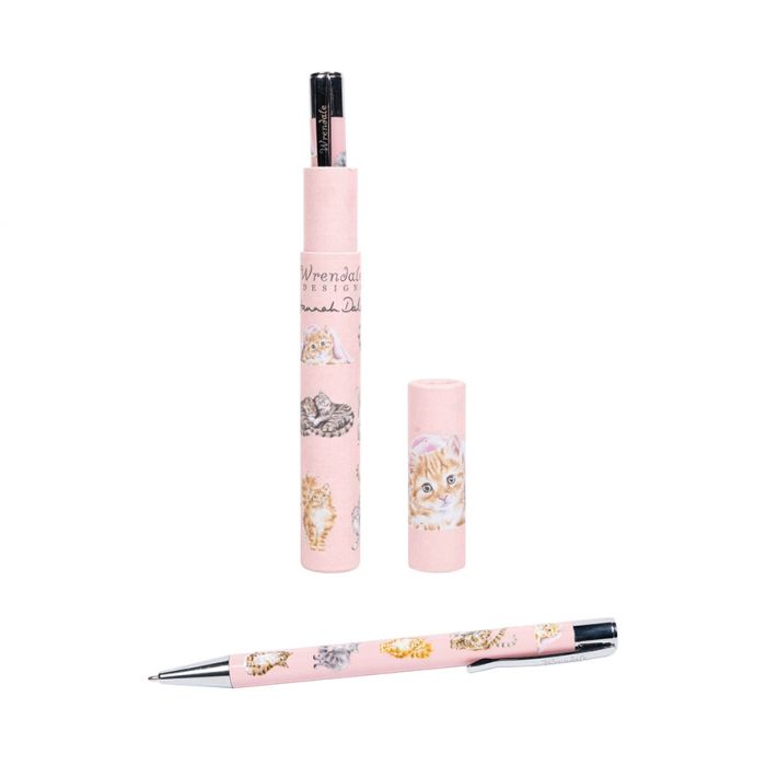 Lägg till en extra blomstring till ditt skrivande med denna underbara penna med ett härligt kattmönster på en rosa bakgrund. Underbar kvalitet och med en härlig känsla, pennan ligger tung i handen och skriver vackert. Pennan levereras i en presentask i tub i samma design vilket gör den till en härlig present.