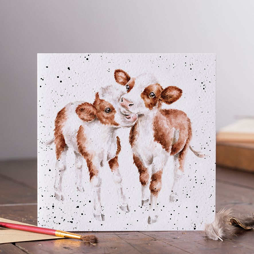 Med två härliga kalvar är detta kort perfekt för alla tillfällen. Bilden är tryckt på högkvalitativ, hållbart framställd texturerad tavla och lämnas tom inuti för ditt eget budskap. Levereras med ett återvunnet kraftkuvert och mäter 17cm x 13cm.