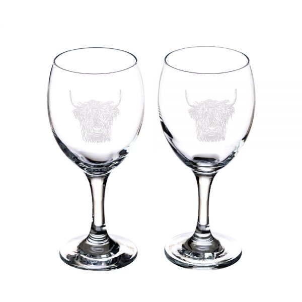Högkvalitativa vin/vattenglas perfekt för att njuta av ett gott vin eller vatten. En uppsättning med 2 glas med vårt signaturtryck av Highland Cow.