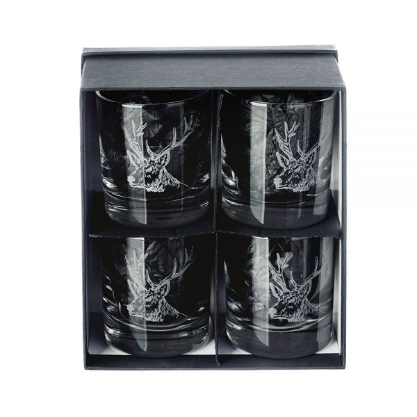 En uppsättning av 4 vackra tumblerglas tryckta med en etseffektdekoration. Varje glas har en majestätisk hjort tryckt, vilket gör dessa till perfekta whiskyglas.