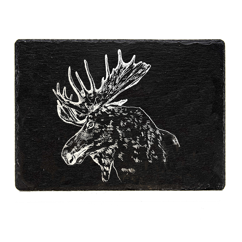 Presentera dina favoritostar på vår snygga graverade älgskifferostbricka. Handskuren i Skottland av skiffer av hög kvalitet, den är inte bara extremt hållbar utan har en mångsidig funktionalitet och naturlig samtida elegans. Vår rektangulära skifferostskiva har graverats med vår handillustrerade bild av en storslagen älg som lägger till ett extra element av stil och glädje.