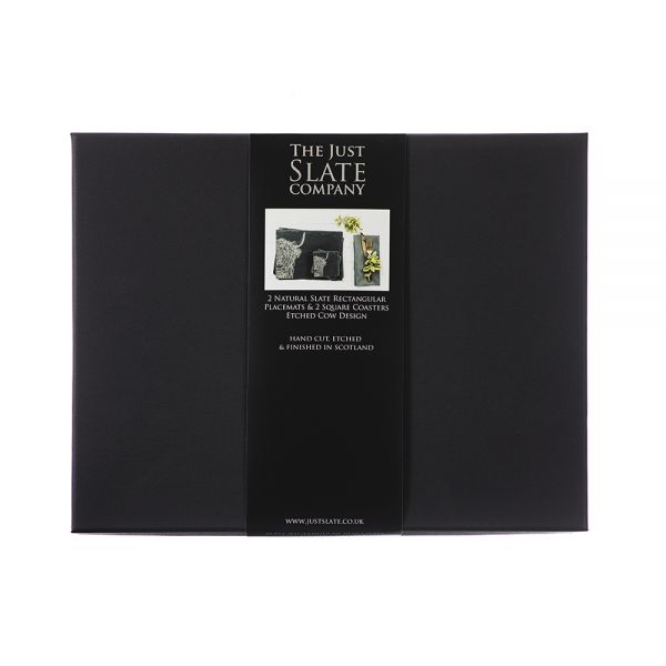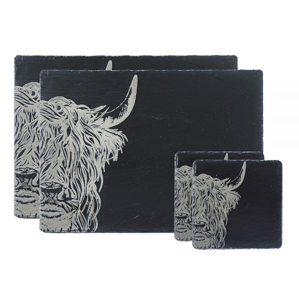 Skapa det perfekta lantliga köket eller matbordet för två med vårt highland cow-graverade set med bords- och glasunderlägg.