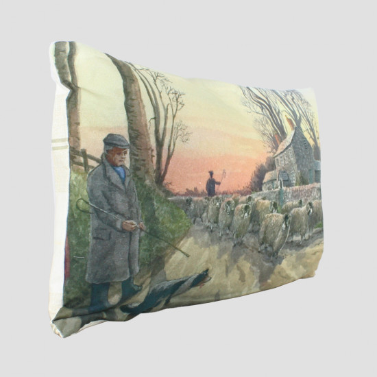 Kudde med herdar och deras hund som vallar fåren genom grinden med en härlig röd himmel i bakgrunden. På baksidan finns ett krämfärgat tryck i tweedstil. Kudden är 34cm x 56cm. Tillverkad av en bomullscanvas och kan tvättas i maskin.