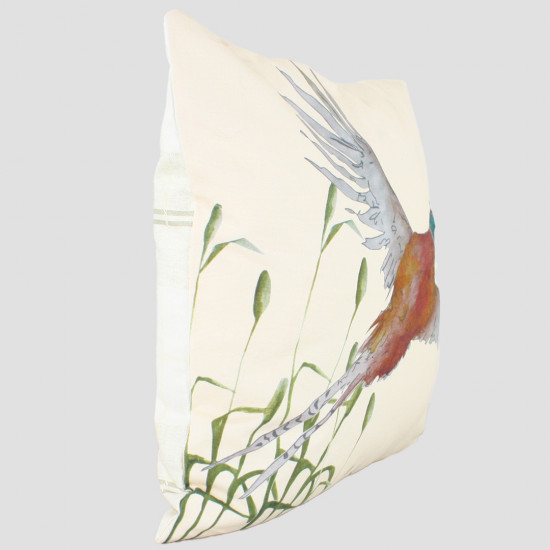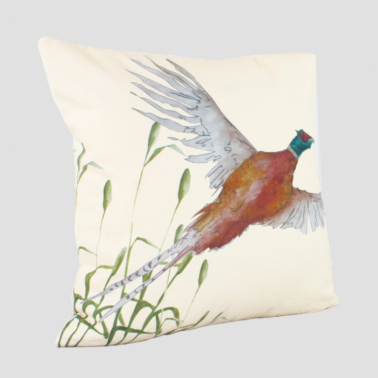 Krämfärgad kudde med en flygande fasandesign på framsidan och ett krämfärgat tryck i tweedstil på baksidan. Kudden är 40cm x 40cm. tillverkad av bomullscanvas och kan tvättas i maskin.