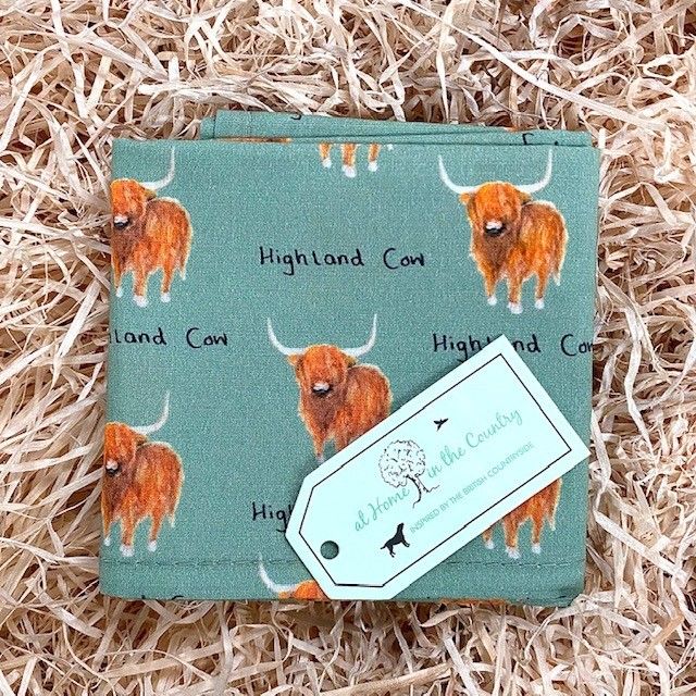 En grön näsduk av 100 % bomull med Highland Cow-design och texten 'Highland Cow'.